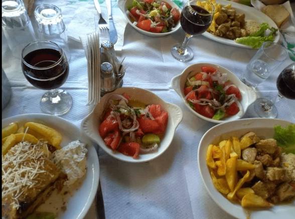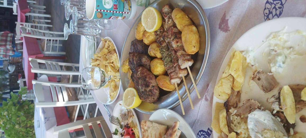 Przykładowo, sałatka grecka przy cenie ok 7,5e to miska sałatki dla 3osobowej rodziny i zamawia się jedną na stół dla wszystkich, a nie tak, jak jest to przyjęte w polskich barach i restauracjach - jedna porcja dla każdej osoby (w Grecji byłoby to nie do przejedzenia). Podobnie rzecz ma się z innymi daniami, takimi jak frytki, przekąski, małe rybki (zwane gawroszami), mięsem czy też kalmarami. Zwyczajowo Grecy zamawiają po jednej porcji kilku potraw i nakładają je z jednego półmiska, na własne talerze (co komu z biesiadników smakuje). Można też zamówić u kelnera konkretną porcje np. suflaków z frytkami, wtedy będzie to podane jak typowe polskie drugie danie, jednak w greckiej tradycji stosuje się najczęściej ten pierwszy sposób i ten państwu polecamy. Jeśli ktoś chce zjeść coś na szybko, najlepszy jest gyros pita, podobny do potrawy nazywanej w naszym kraju kebabem. Jest on sycący, bardzo smaczny i starannie wykonany najcześciej z mięsa własnoręcznie przygotowywanego przez właścicieli restauracji. Polecamy przyjrzeć się, z jaką biegłością i wprawą jest robiony.